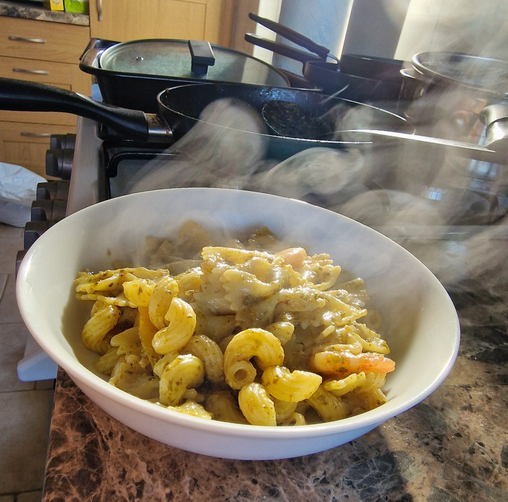 Pasta with prawns, peppers, and pesto sauce