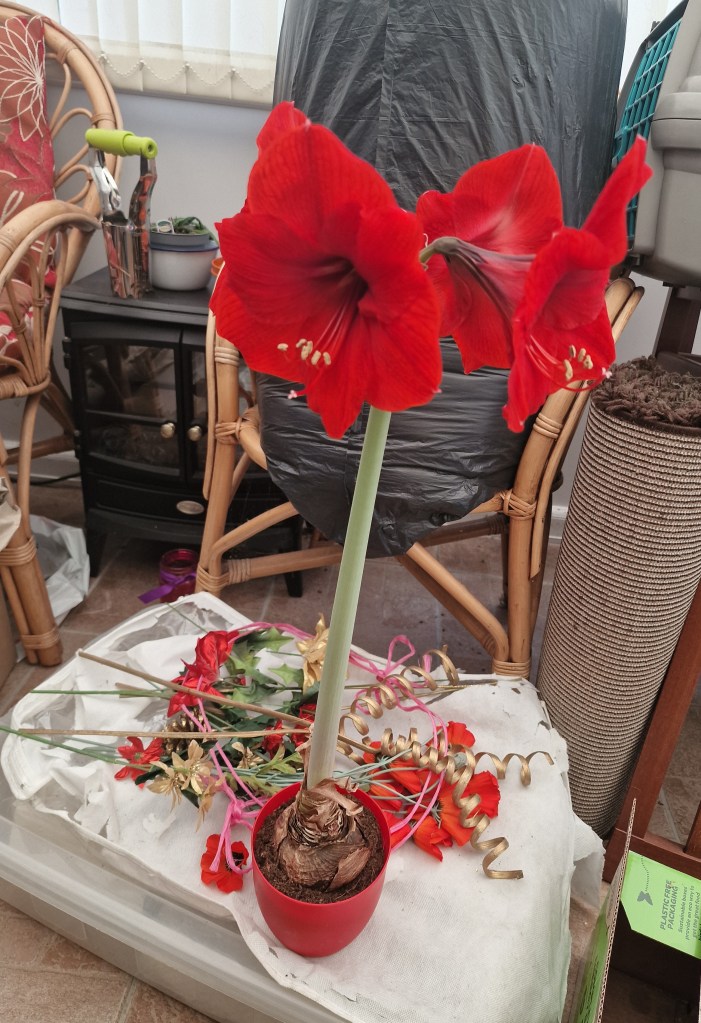I was so busy keeping my plate free from an inquisitive feline nose that I forgot to take a photo. So instead here’s mum’s stunningly beautiful amaryllis, safely away from Suki in the conservatory.
