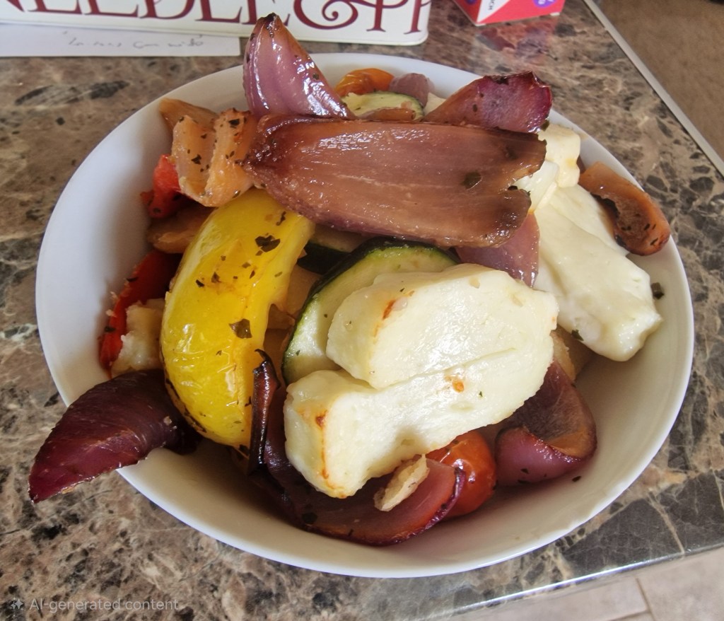 Roasted Mediterranean veg, halloumi, crispy potato slices