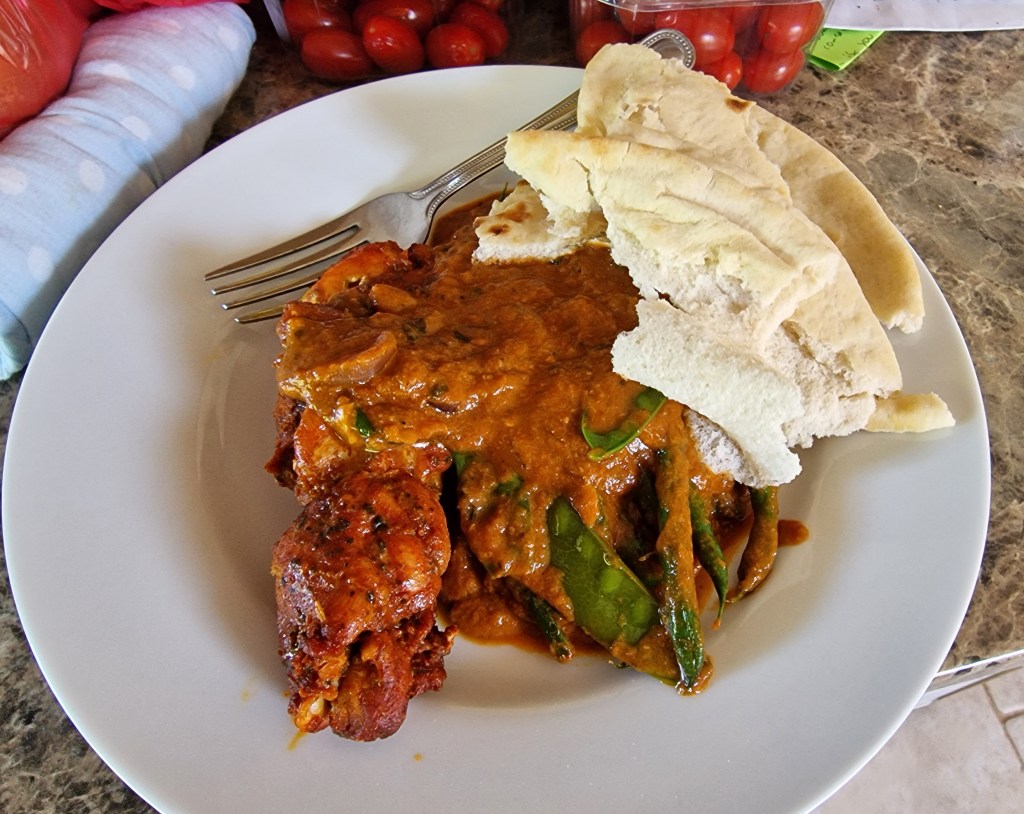 Dinner was butter chicken kebabs (from Iceland’s bbq range), butter vegetable curry (from a Patak’s kit), and flatbreads. Mum looked at the chicken kebabs and said, “they look nice, but you know what I really like? Jacket potatoes!” (Well, she actually said “those round things”, which can mean anything from an apple to a tub of ice cream to a hot cross bun or, in this case, a jacket potato.)