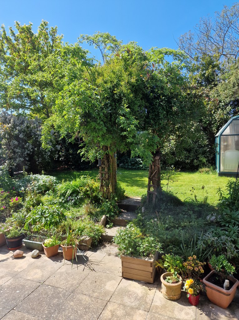 The weather being rather lovely today, I took the opportunity to climb up to the upper part of the garden to see what’s growing in dad’s old veg patch. This part of the garden is only one step down and three steps up from my bedroom, but the three steps are made of uneven concrete, covered with bird poo from the bird nests within the tangle of greenery that is low enough that I have to duck1, with plants growing over the sides, and generally a dangerous nuisance to negotiate on crutches.